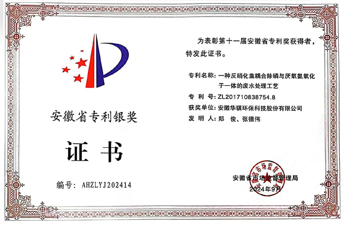 9月3日,安徽省市場監(jiān)督管理局(安徽省知識產(chǎn)權(quán)局)公示了第十一屆安徽省專利獎評選結(jié)果。華騏環(huán)保“一種反硝化集耦合除磷與厭氧氨氧化于一體的廢水處理工藝”發(fā)明專利榮獲安徽省專利銀獎。
