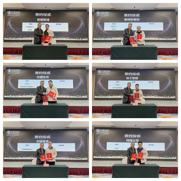 華騏環(huán)保旗下安徽英特倫智控股份有限公司、安徽華騏蔚藍智能裝備有限公司、安徽華騏管家環(huán)保咨詢服務(wù)有限公司、安徽華騏生態(tài)環(huán)境材料有限公司以及2024年新成立的安徽雙工智聯(lián)環(huán)??萍脊煞萦邢薰?、馬鞍山市緯度建筑工程有限公司六家主要專業(yè)子公司齊聚一堂,匯報了2024年的經(jīng)營成果、核心業(yè)務(wù)發(fā)展,制定了主要專業(yè)子公司三年發(fā)展規(guī)劃,并舉行了2025年承諾指標簽約儀式。