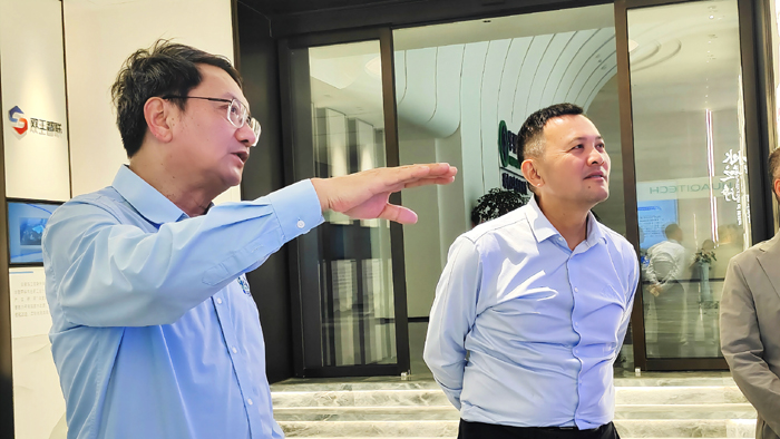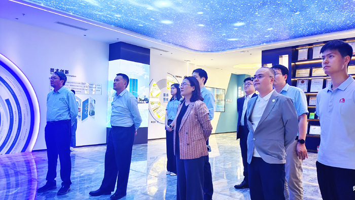 考察期間,李衛(wèi)國董事長一行參觀華騏環(huán)保展廳,詳細了解企業(yè)的科技創(chuàng)新成果、產(chǎn)業(yè)布局及企業(yè) “走出去” 的實踐探索。華騏環(huán)保董事長王健熱情的向來訪嘉賓介紹了公司戰(zhàn)略規(guī)劃、市場運營等情況,展示企業(yè)實力。