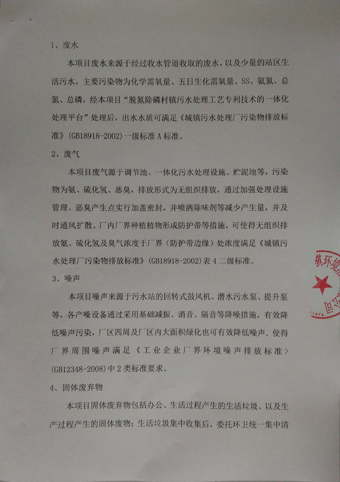 本項(xiàng)目廢水來(lái)源于經(jīng)過(guò)收水管道收取的廢水,以及少量的站區(qū)生活污水,主要污染物為化學(xué)需氧量、五日生化需氧量、SS、氨氮、總氮、總磷,經(jīng)本項(xiàng)目“脫氮除磷村鎮(zhèn)污水處理工藝專(zhuān)利技術(shù)的一體化處理平臺(tái)”處理后,出水水質(zhì)可滿(mǎn)足《城鎮(zhèn)污水處理廠(chǎng)污染物排放標(biāo)準(zhǔn)》(GB18918-2002)一級(jí)標(biāo)準(zhǔn)A標(biāo)準(zhǔn)。