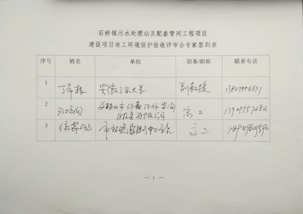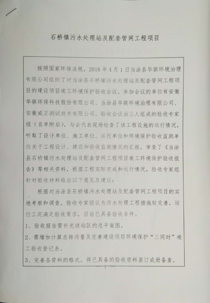 按照國(guó)家環(huán)保法規(guī),2018年4月1日當(dāng)涂縣華騏環(huán)境治理有限公司組織了對(duì)當(dāng)涂縣石橋鎮(zhèn)污水處理站及配套管網(wǎng)工程項(xiàng)目的建設(shè)項(xiàng)目竣工環(huán)境保護(hù)驗(yàn)收會(huì)議。參加會(huì)議的單位有安徽華騏環(huán)??萍脊煞萦邢薰?、當(dāng)涂縣華騏環(huán)境治理有限公司、安徽威正測(cè)試技術(shù)有限公司。驗(yàn)收會(huì)議由三人組成的驗(yàn)收專(zhuān)家組(名單附后),與會(huì)代表現(xiàn)場(chǎng)檢查了該工程設(shè)施的運(yùn)行情況,聽(tīng)取了設(shè)計(jì)單位、施工單位、運(yùn)行單位和環(huán)境保護(hù)驗(yàn)收監(jiān)測(cè)單位關(guān)于工程設(shè)計(jì)、建設(shè)和驗(yàn)收監(jiān)測(cè)情況的匯報(bào),審查了《當(dāng)涂縣石橋鎮(zhèn)污水處理站及配套管網(wǎng)工程項(xiàng)目竣工環(huán)境保護(hù)驗(yàn)收?qǐng)?bào)告》等相關(guān)資料,根據(jù)工程實(shí)際完成和運(yùn)行情況,驗(yàn)收專(zhuān)家組針對(duì)驗(yàn)收材料給出以下意見(jiàn)及建議: