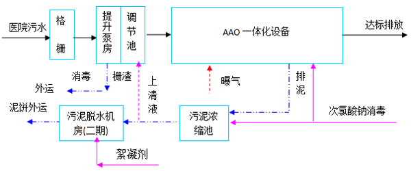 馬鞍山市秀山新區(qū)綜合醫(yī)院將建成集醫(yī)療、科研、教學(xué)、預(yù)防、保健、急救為一體的三級現(xiàn)代化綜合醫(yī)院。醫(yī)院污水主要為醫(yī)療及病房區(qū)污水,設(shè)計建設(shè)總規(guī)模為Q=1200 m3/d,分為兩期,一期配套設(shè)備規(guī)模Q=600 m3/d,處理工藝采用:AAO+沉淀+消毒,污水處理站24小時運行,全自動控制。經(jīng)污水處理站經(jīng)處理,符合《醫(yī)療機構(gòu)水污染排放標(biāo)準(zhǔn)》(GB18466-2005)中預(yù)處理標(biāo)準(zhǔn)后排入市政污水收集管網(wǎng),經(jīng)東部污水處理廠處理達(dá)標(biāo)后外排。